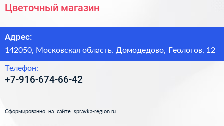 Цветочный магазин по адресу 142050, Московская область, Домодедово, Геологов, 12 в дальнейшем Организация, размещена в следующих категориях:
