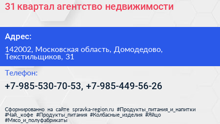 31 квартал, агентство недвижимости по адресу 142002, Московская область, Домодедово, Текстильщиков, 31 в дальнейшем Организация, размещена в следующих категориях: