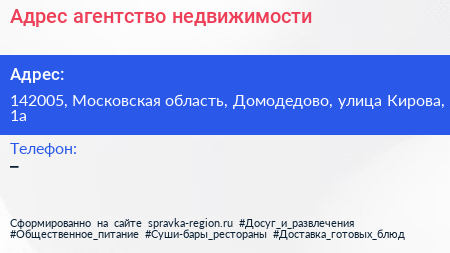 Адрес, агентство недвижимости по адресу 142005, Московская область, Домодедово, улица Кирова, 1а в дальнейшем Организация, размещена в следующих категориях: