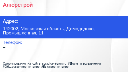 Алюрстрой по адресу 142002, Московская область, Домодедово, Промышленная, 11 в дальнейшем Организация, размещена в следующих категориях:
