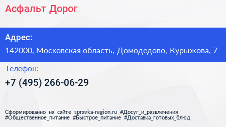Асфальт-Дорог по адресу 142000, Московская область, Домодедово, Курыжова, 7 в дальнейшем Организация, размещена в следующих категориях: