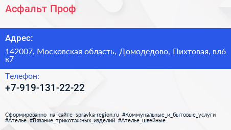 Асфальт Проф по адресу 142007, Московская область, Домодедово, Пихтовая, вл6 к7 в дальнейшем Организация, размещена в следующих категориях: