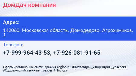 ДомДач, компания по адресу 142060, Московская область, Домодедово, Агрохимиков, 1 в дальнейшем Организация, размещена в следующих категориях: