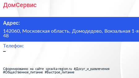 ДомСервис по адресу 142060, Московская область, Домодедово, Вокзальная 1-я, 48 в дальнейшем Организация, размещена в следующих категориях: