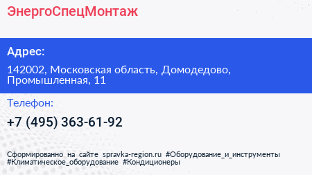 ЭнергоСпецМонтаж по адресу 142002, Московская область, Домодедово, Промышленная, 11 в дальнейшем Организация, размещена в следующих категориях: