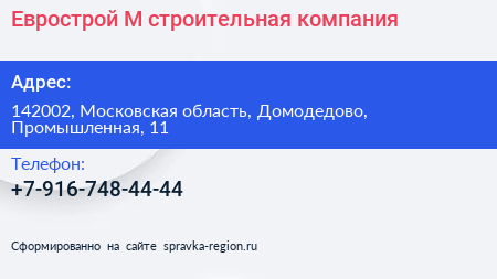 Еврострой-М, строительная компания по адресу 142002, Московская область, Домодедово, Промышленная, 11 в дальнейшем Организация, размещена в следующих категориях:
