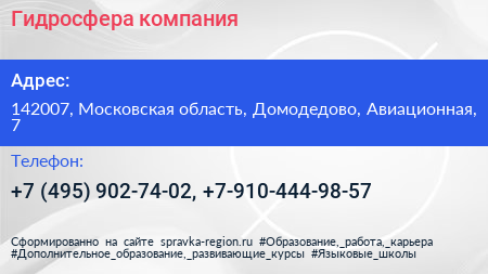 Гидросфера, компания по адресу 142007, Московская область, Домодедово, Авиационная, 7 в дальнейшем Организация, размещена в следующих категориях: