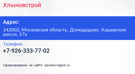 Хлыновстрой по адресу 142002, Московская область, Домодедово, Каширское шоссе, 17а в дальнейшем Организация, размещена в следующих категориях: