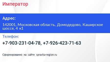 Император по адресу 142001, Московская область, Домодедово, Каширское шоссе, 4 к1 в дальнейшем Организация, размещена в следующих категориях: