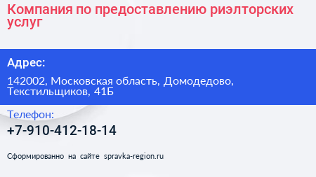 Компания по предоставлению риэлторских услуг по адресу 142002, Московская область, Домодедово, Текстильщиков, 41Б в дальнейшем Организация, размещена в следующих категориях: