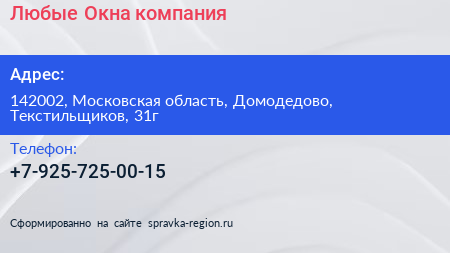 Любые Окна, компания по адресу 142002, Московская область, Домодедово, Текстильщиков, 31г в дальнейшем Организация, размещена в следующих категориях:
