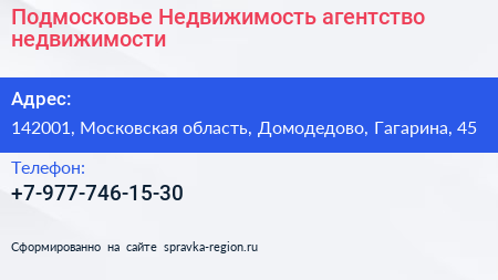 Подмосковье Недвижимость, агентство недвижимости по адресу 142001, Московская область, Домодедово, Гагарина, 45 в дальнейшем Организация, размещена в следующих категориях: