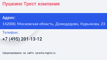 Пушкино Трест, компания по адресу 142000, Московская область, Домодедово, Курыжова, 23 в дальнейшем Организация, размещена в следующих категориях: