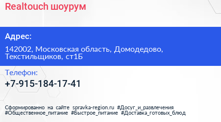 Realtouch, шоурум по адресу 142002, Московская область, Домодедово, Текстильщиков, ст1Б в дальнейшем Организация, размещена в следующих категориях: