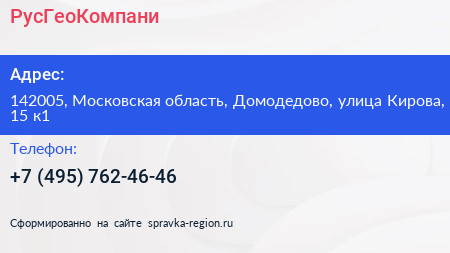 РусГеоКомпани по адресу 142005, Московская область, Домодедово, улица Кирова, 15 к1 в дальнейшем Организация, размещена в следующих категориях: