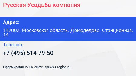 Русская Усадьба, компания по адресу 142002, Московская область, Домодедово, Станционная, 14 в дальнейшем Организация, размещена в следующих категориях: