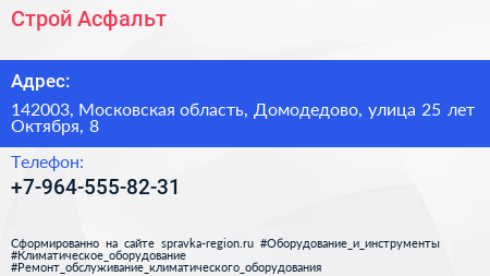 Строй-Асфальт по адресу 142003, Московская область, Домодедово, улица 25 лет Октября, 8 в дальнейшем Организация, размещена в следующих категориях: