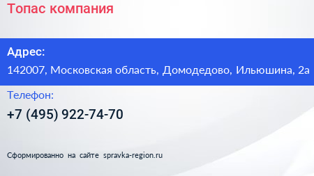 Топас, компания по адресу 142007, Московская область, Домодедово, Ильюшина, 2а в дальнейшем Организация, размещена в следующих категориях: