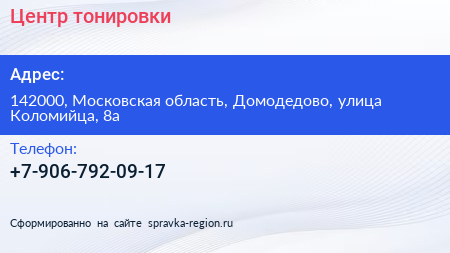 Центр тонировки по адресу 142000, Московская область, Домодедово, улица Коломийца, 8а в дальнейшем Организация, размещена в следующих категориях: