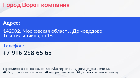 Город-Ворот, компания по адресу 142002, Московская область, Домодедово, Текстильщиков, ст1Б в дальнейшем Организация, размещена в следующих категориях: