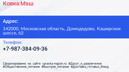 Ковка Маш по адресу 142000, Московская область, Домодедово, Каширское шоссе, 62 в дальнейшем Организация, размещена в следующих категориях:
