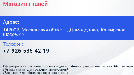 Магазин тканей по адресу 142002, Московская область, Домодедово, Каширское шоссе, 49 в дальнейшем Организация, размещена в следующих категориях: