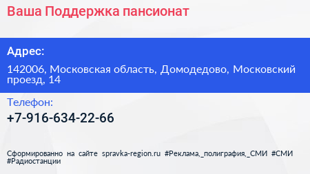 Ваша Поддержка, пансионат по адресу 142006, Московская область, Домодедово, Московский проезд, 14 в дальнейшем Организация, размещена в следующих категориях: