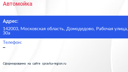 Автомойка по адресу 142003, Московская область, Домодедово, Рабочая улица, 30а в дальнейшем Организация, размещена в следующих категориях: