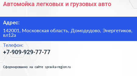 Автомойка легковых и грузовых авто по адресу 142001, Московская область, Домодедово, Энергетиков, вл12а в дальнейшем Организация, размещена в следующих категориях: