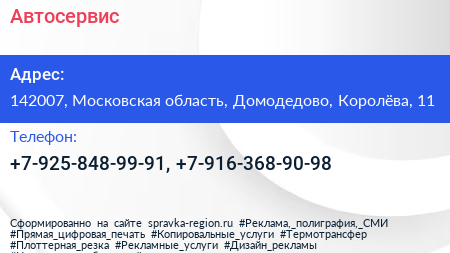 Автосервис по адресу 142007, Московская область, Домодедово, Королёва, 11 в дальнейшем Организация, размещена в следующих категориях: