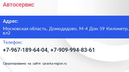 Автосервис по адресу Московская область, Домодедово, М-4 Дон 59 Километр, вл2 в дальнейшем Организация, размещена в следующих категориях: