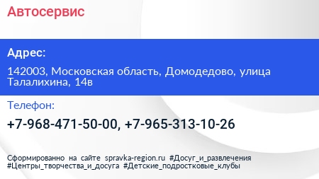 Автосервис по адресу 142003, Московская область, Домодедово, улица Талалихина, 14в в дальнейшем Организация, размещена в следующих категориях: