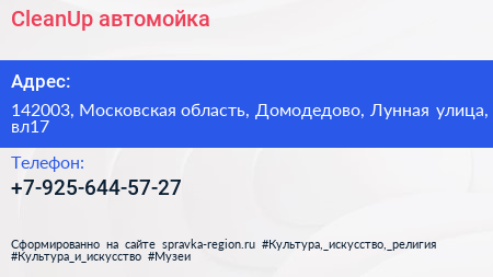 CleanUp, автомойка по адресу 142003, Московская область, Домодедово, Лунная улица, вл17 в дальнейшем Организация, размещена в следующих категориях: