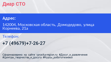 Диар, СТО по адресу 142004, Московская область, Домодедово, улица Корнеева, 21а в дальнейшем Организация, размещена в следующих категориях: