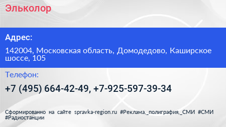 Эльколор по адресу 142004, Московская область, Домодедово, Каширское шоссе, 105 в дальнейшем Организация, размещена в следующих категориях: