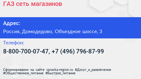 ГАЗ, сеть магазинов по адресу 3, Объездное шоссе, Авдотьино, посёлок Государственного Племенного Завода "Константиново", городской округ Домодедово, Московская область, Центральный федеральный округ, 142032, Россия в дальнейшем Организация, размещена в следующих категориях: