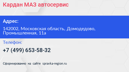Кардан МАЗ, автосервис по адресу 142002, Московская область, Домодедово, Промышленная, 11а в дальнейшем Организация, размещена в следующих категориях: