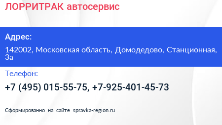 ЛОРРИТРАК, автосервис по адресу 142002, Московская область, Домодедово, Станционная, 3а в дальнейшем Организация, размещена в следующих категориях: