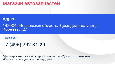 Магазин автозапчастей по адресу 142004, Московская область, Домодедово, улица Корнеева, 27 в дальнейшем Организация, размещена в следующих категориях:
