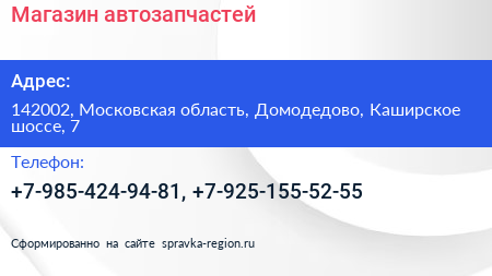 Магазин автозапчастей по адресу 142002, Московская область, Домодедово, Каширское шоссе, 7 в дальнейшем Организация, размещена в следующих категориях: