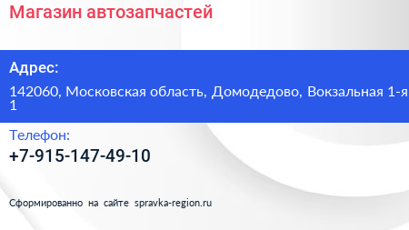Магазин автозапчастей по адресу 142060, Московская область, Домодедово, Вокзальная 1-я, 1 в дальнейшем Организация, размещена в следующих категориях: