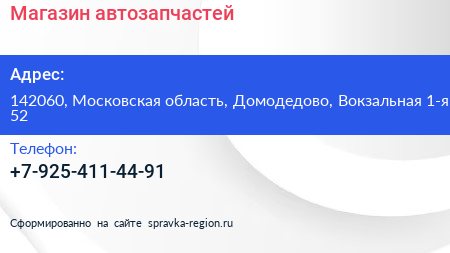 Магазин автозапчастей по адресу 142060, Московская область, Домодедово, Вокзальная 1-я, 52 в дальнейшем Организация, размещена в следующих категориях: