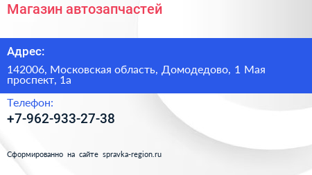 Магазин автозапчастей по адресу 142006, Московская область, Домодедово, 1 Мая проспект, 1а в дальнейшем Организация, размещена в следующих категориях: