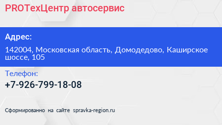 PROТехЦентр, автосервис по адресу 142004, Московская область, Домодедово, Каширское шоссе, 105 в дальнейшем Организация, размещена в следующих категориях: