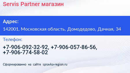 Servis-Partner, магазин по адресу 142001, Московская область, Домодедово, Дачная, 34 в дальнейшем Организация, размещена в следующих категориях: