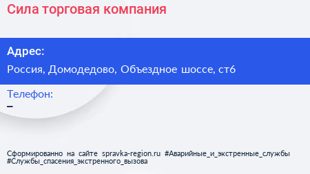 Сила, торговая компания по адресу с6, Объездное шоссе, Авдотьино, посёлок Государственного Племенного Завода "Константиново", городской округ Домодедово, Московская область, Центральный федеральный округ, 142032, Россия в дальнейшем Организация, размещена в следующих категориях:
