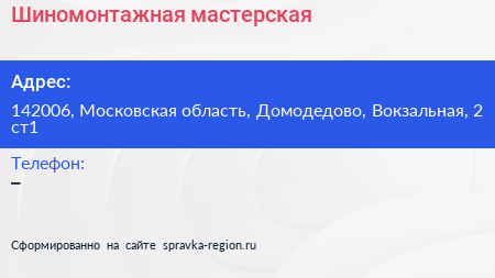 Шиномонтажная мастерская по адресу 142006, Московская область, Домодедово, Вокзальная, 2 ст1 в дальнейшем Организация, размещена в следующих категориях: