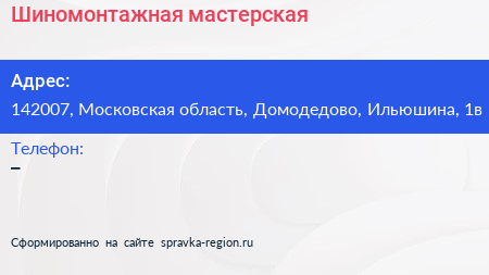 Шиномонтажная мастерская по адресу 142007, Московская область, Домодедово, Ильюшина, 1в в дальнейшем Организация, размещена в следующих категориях: