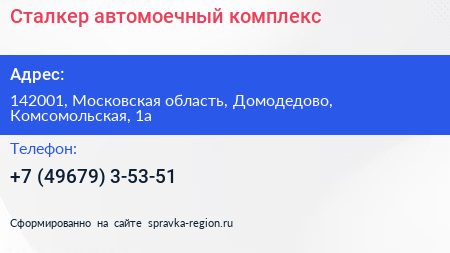 Сталкер, автомоечный комплекс по адресу 142001, Московская область, Домодедово, Комсомольская, 1а в дальнейшем Организация, размещена в следующих категориях:
