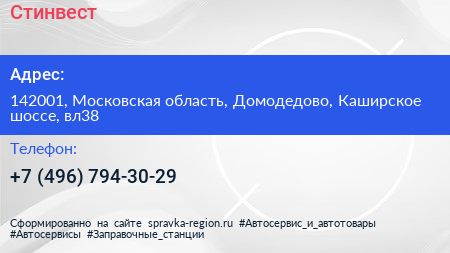 Стинвест по адресу 142001, Московская область, Домодедово, Каширское шоссе, вл38 в дальнейшем Организация, размещена в следующих категориях: